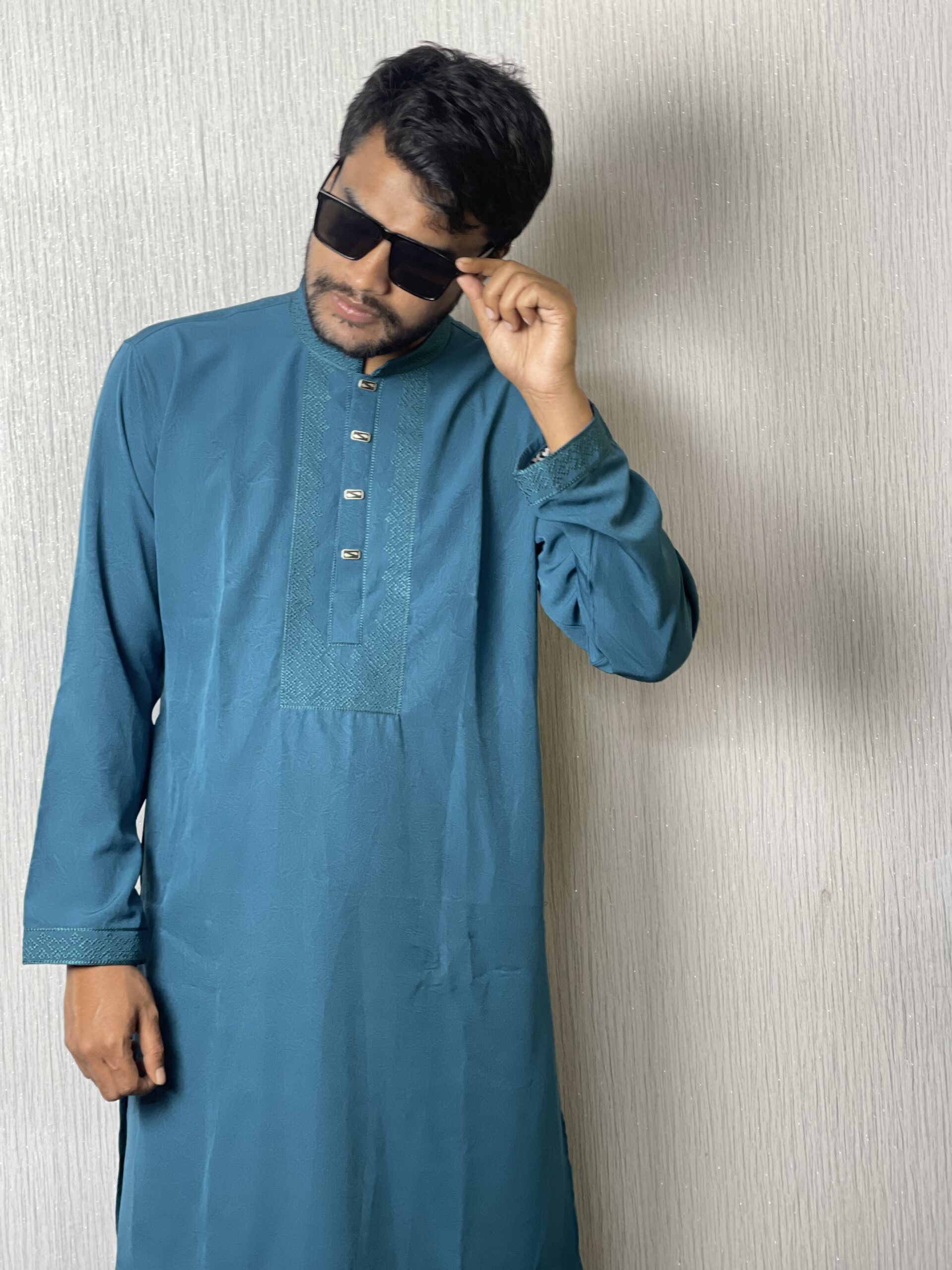 Step into sophistication with this striking Panjabi (kurta) in a rich, captivating Teal or Deep Aqua Blue color. This piece elevates a solid base with beautifully detailed embroidery on the yoke and cuffs, offering a refined, elegant look perfect for any special occasion.