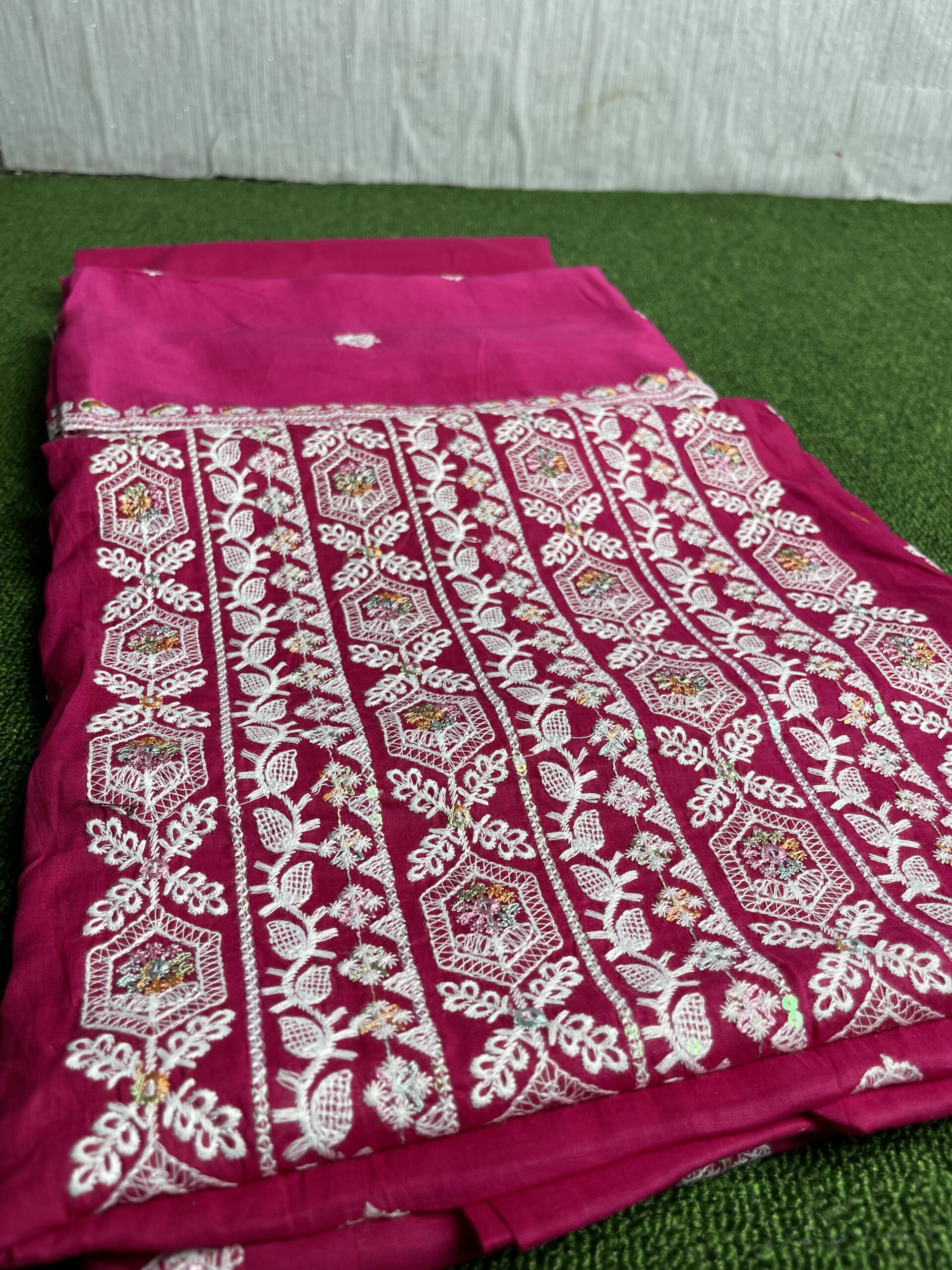 Design: Heavily and intricately embroidered with a detailed pattern running vertically across the fabric. The work appears to be chikankari style or fine thread work, primarily in white or contrasting thread, accented with subtle, multi-colored embellishments (possibly small mirrors or sequin work) within the geometric and floral motifs. The density of the embroidery makes this the focal point of the outfit.