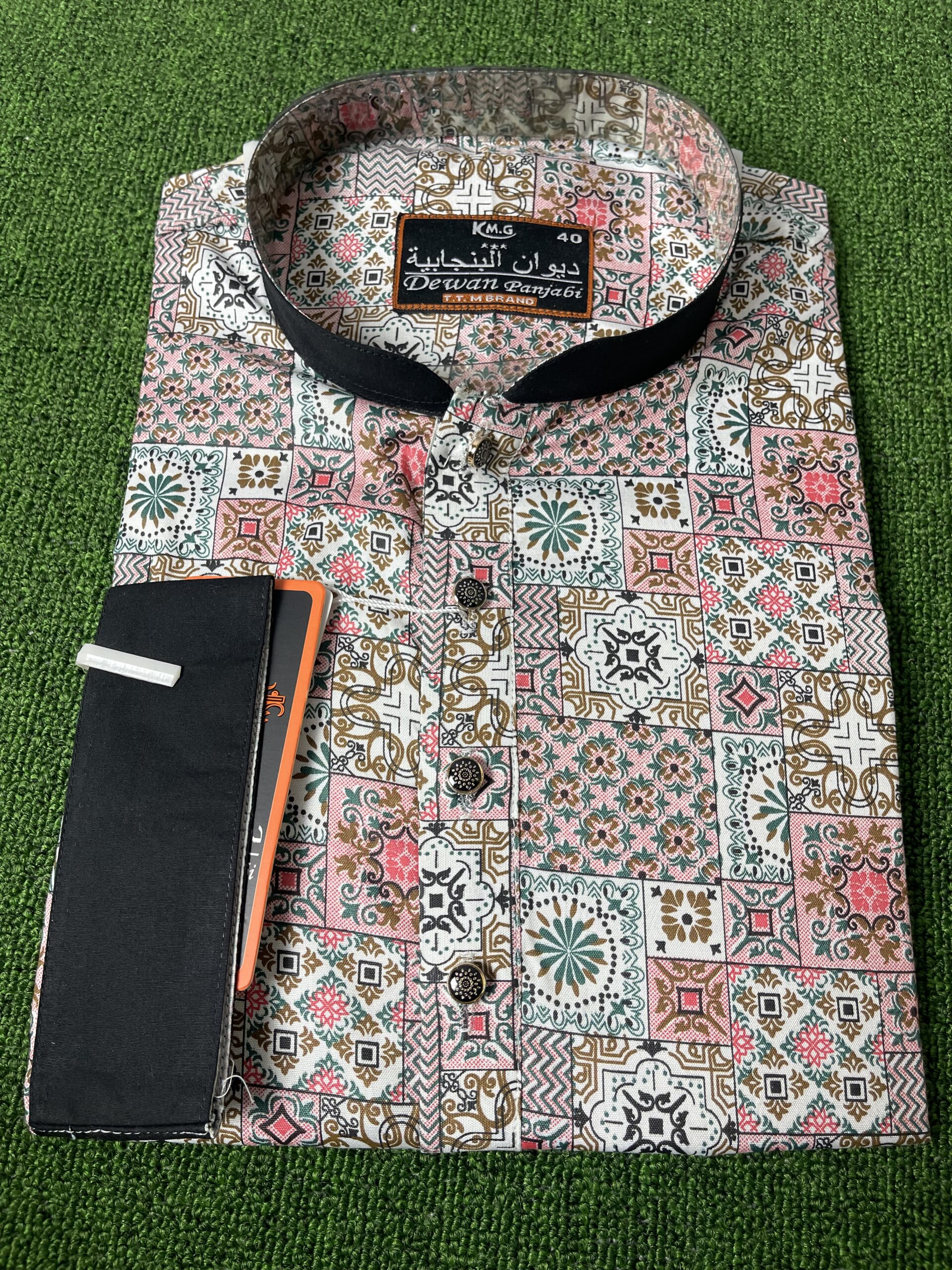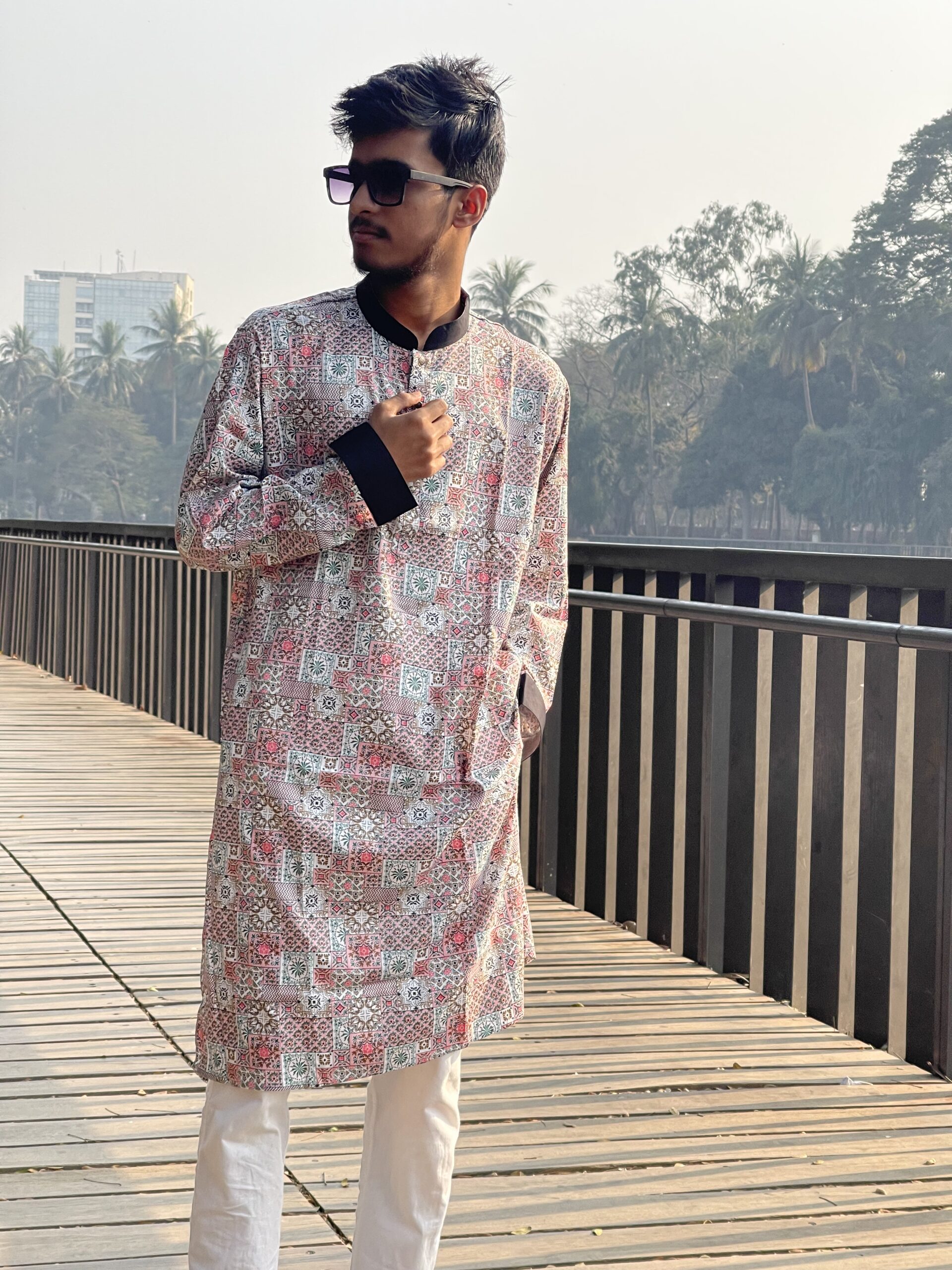 Infuse your traditional wear collection with color and pattern with this striking Panjabi (kurta). It features a beautiful geometric and tile-inspired print in a sophisticated palette of earthen tones, soft pinks, and deep greens against an off-white base. The design is framed by crisp, contrasting black trim on the collar and cuffs, adding a sharp, contemporary edge to the festive look.